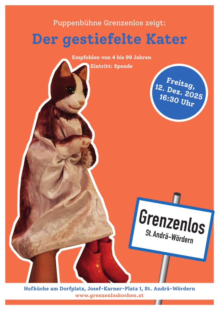 Fr., 12. Dez., 16,30 h: Grenzenlos Puppenbühne spielt: „Der gestiefelte Kater“ am DORFPLATZ