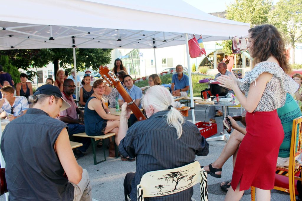 GRÄTZELFESTE AUS ALLER WELT: 5 Grätzelfeste luden zur Reise durch Kultur und Küche der jeweiligen Kontinente ein. Neben einfachen Gerichten gab es ein künstlerisches Begleitprogramm: Erzählen, Singen, Puppentheater und Musikprogramm mit Bezug zum Kontinent.Eine Fotobox mit großflächigen Klischeebildern aus dem Kontinent ermöglichte Erinnerungsfotos – sozusagen als schnelle Reise zu Sehenswürdigkeiten dieses Erdteils.